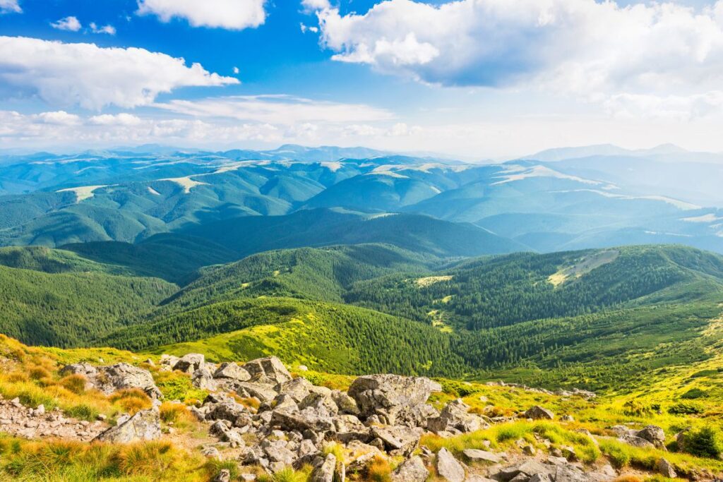 Visitors can explore hiking trails, forest paths, and viewpoints overlooking valleys and mountains.